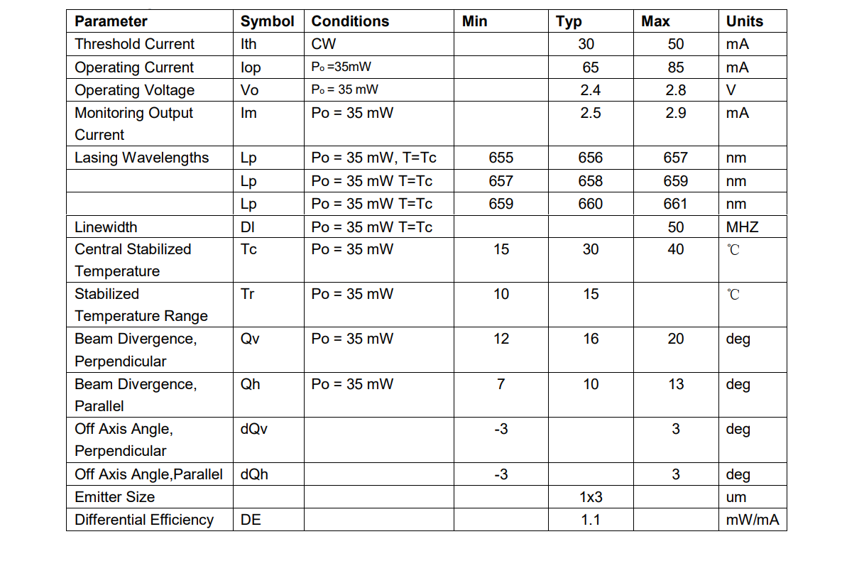 658nm Wavelength Stabilized Laser is a single mode, miniature laser in a standard TO package. The laser has a very low temperature dependence and precise center wavelength overthe locked region.The narrow linewidth and long coherence length from a standard TO packaged laser enables many applications.
